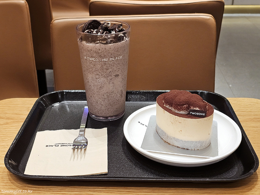 지인분의 하트 12개적립 무료 음료 쿠폰 지원으로 성사된 투썸 야식 타임.. 신메뉴 금귤 생크림 케이크를 노렸으나 솔드아웃이라 오벌 티라미수로..