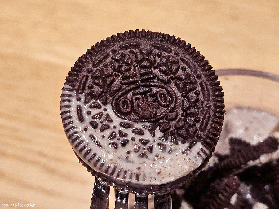 지인분께서 쿠키쉐이크는 어차피 갈아서 만드는 거니 오레오 짭인 오리온 샌드 까메오 등이 아닐까 하는 의심을 하셨는데요.. 오레오 초콜릿 샌드위치 쿠키 화이트 크림 정품을 사용하고 있는 것 확인했습니다.. 투썸은 짭 안 써요.. ㅡㅡ;;..
