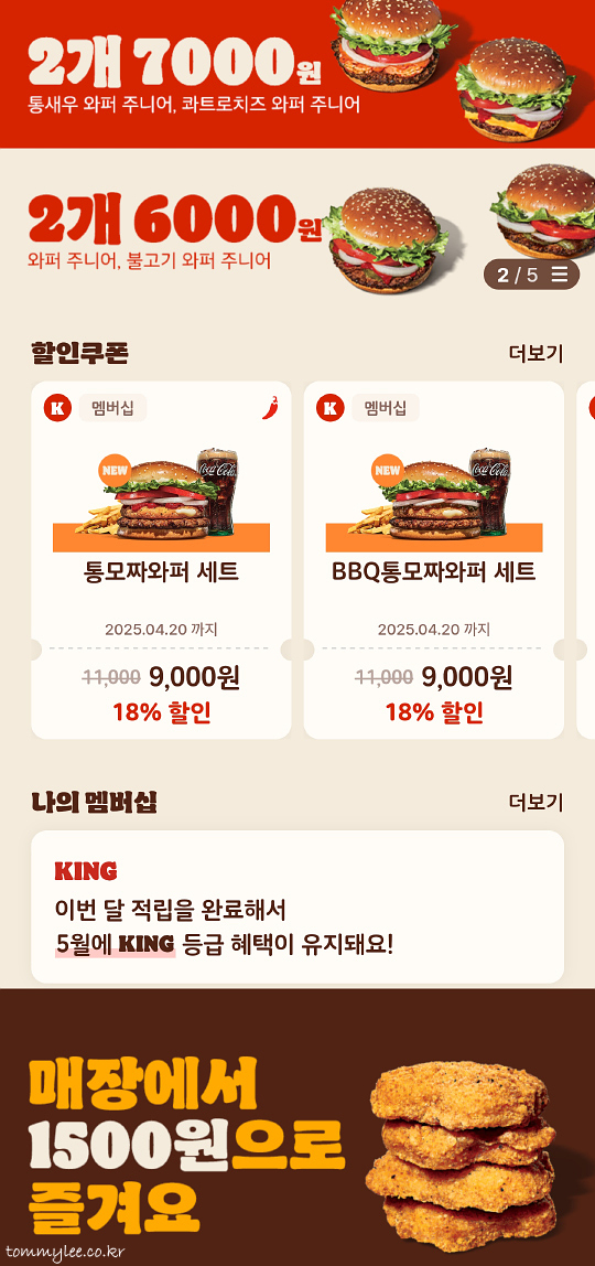 와퍼 20년 전 가격 행사는 종료되었고요.. 지금은 주니어 버거 할인 행사 중입니다.. 와퍼주니어, 불고기와퍼주니어 2개 6,000원 / 통새우와퍼주니어, 콰트로치즈와퍼주니어 7,000원 행사가 진행 중이고요.. 너겟킹 4개 1,500원 행사도 여전히 진행 중..