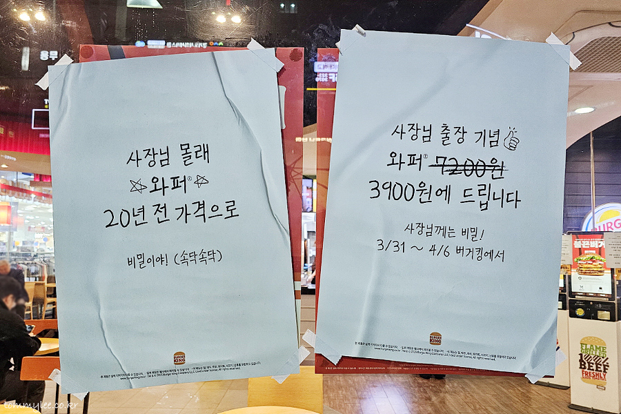 사장님 몰래 와퍼 20년 전 가격으로~ 비밀이야! (속닥속닥).. 사장님 출장 기념 와퍼 3900원에 드립니다.. 사장님께는 비밀 3/31~4/6 버거킹에서.. 저는 4월 5일에 방문..