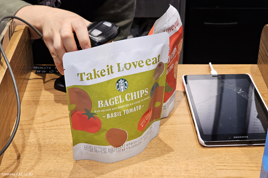 일단 아메리카노로 목을 축인 후 사이렌오더로 템페칩 2+1 행사 참여를 위해 바질토마토 베이글칩과 핫칠리 템페칩을 주문했는데요.. 이게 포스 주문을 해야 2+1 적용이 된다고 해서..
