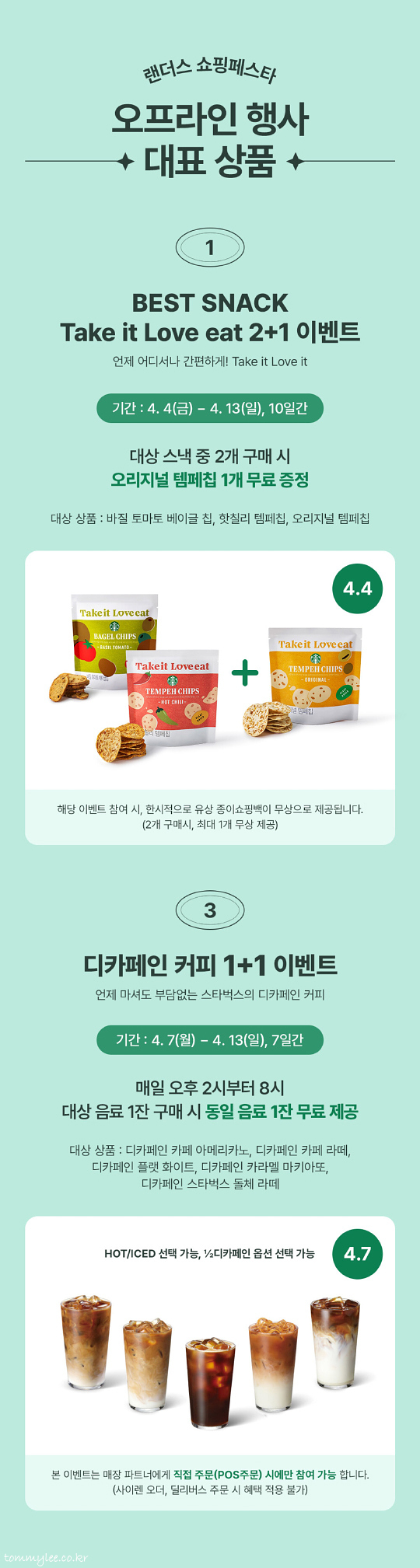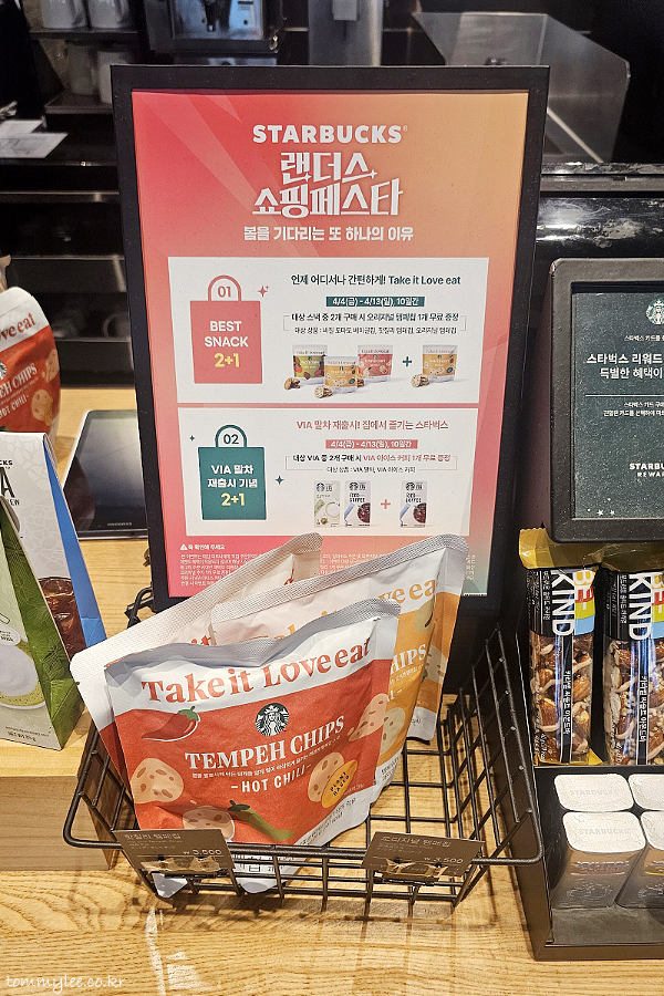 랜더스 쇼핑페스타 스타벅스 매장 행사에 참여했습니다.. 바질토마토 베이글칩, 핫칠리 템페칩 2개 구매 시 오리지널 템페칩을 무료로 주는 템페칩 2+1 행사하고요.. 오후 2시부터 디카페인 카테고리 음료 중에서 하나를 주문하면 동일 음료를 1잔 무료로 제공하는 디카페인 커피 1+1 행사..