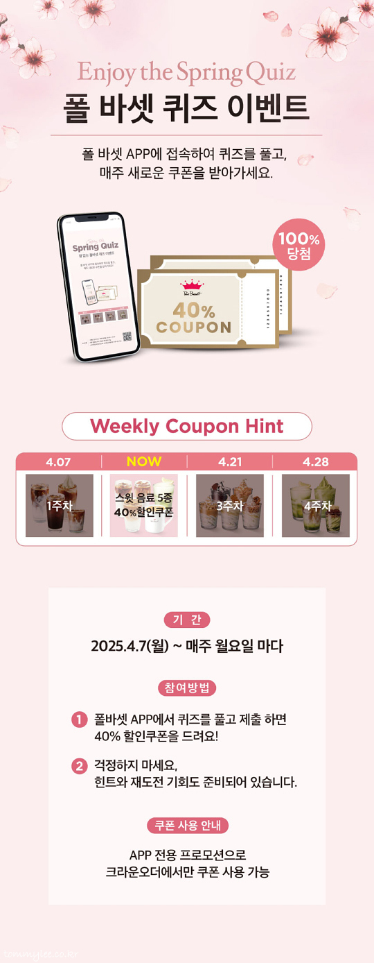 폴바셋 봄 퀴즈 스윗음료 5종, APP 전용 프로모션 2주 차 쿠폰 받은 거.. 제 건 사용하고 지인분께 받은 쿠폰을 또 써줘야 했네요..