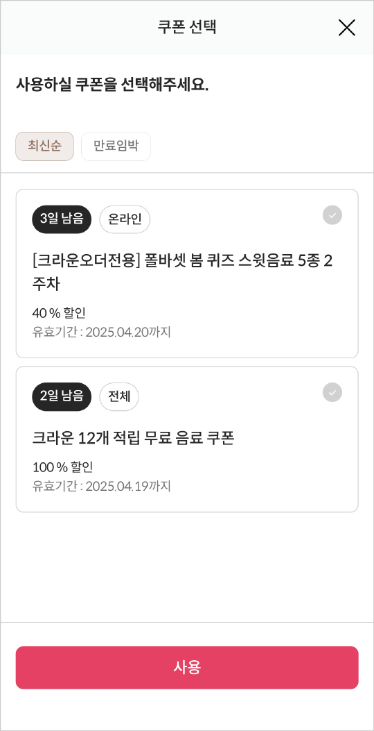 봄 퀴즈 스윗음료 5종 2주 차 쿠폰과 크라운 12개 적립 무료 음료 쿠폰 2장을 동시에 사용해 크라운오더 주문 완료..