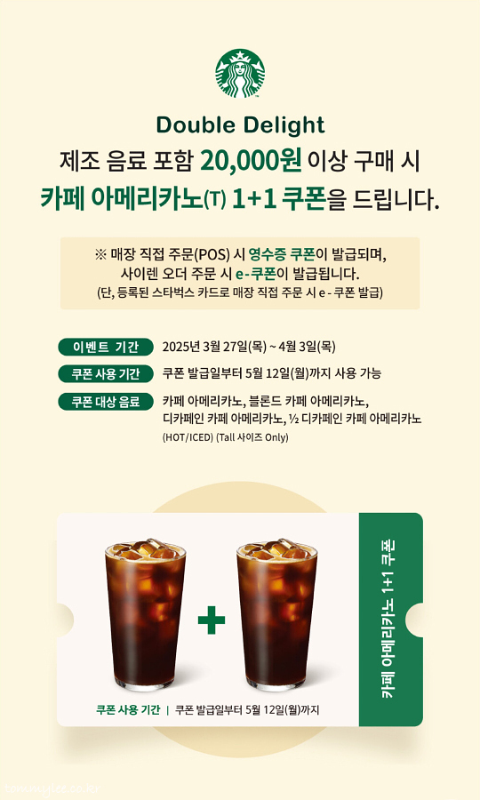 STARBUCKS DOUBLE DELIGHT.. 제조 음료 포함 20,000원 이상 구매 시 카페 아메리카노 1+1 쿠폰을 주는 뜬금없는(?) 행사였답니다.. 뭐 받으려고 일부러 지른 건 아니고 우연히도 2만원 이상 결제를 해서 받게 된 거..