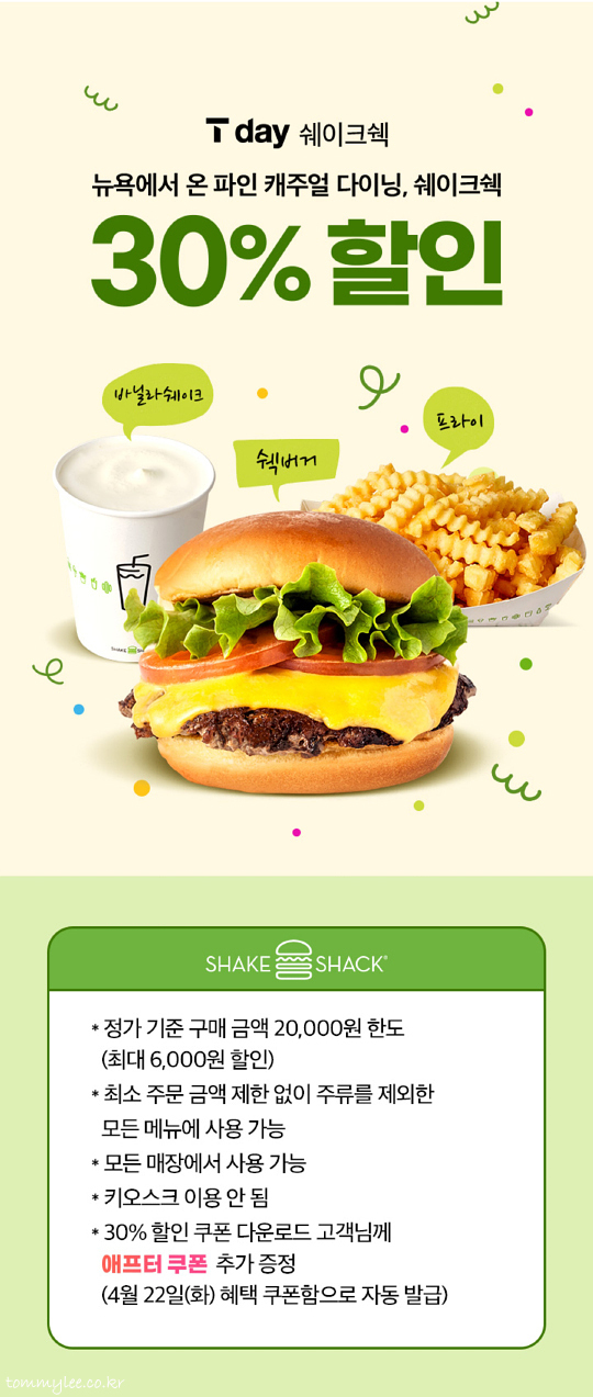 쉐이크쉑 4월 T데이 행사는 이러했는데요.. 맨 아래에 보시면.. 애프터 쿠폰 추가 증정이라고 나와 있는데.. T데이에 쉐이크쉑 쿠폰을 다운로드하면 쿠폰 사용여부에 관계없이 지정된 날에 T멤버십 앱에 애프터 쿠폰이 자동발급된다고 합니다.. T멤버십이 역시 주는 게 많음.. 멤버십은 진짜 SKT가 짱.. KT, 유플러스와는 비교불가..
