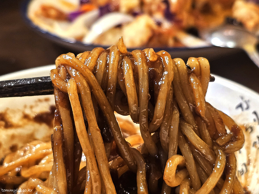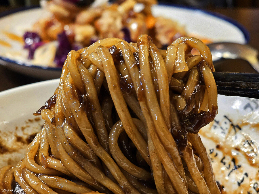 고기가 잘게 다져 들어간 유니짜장과 둥근 중화면을 비벼보면 이런 느낌이 나옵니다..