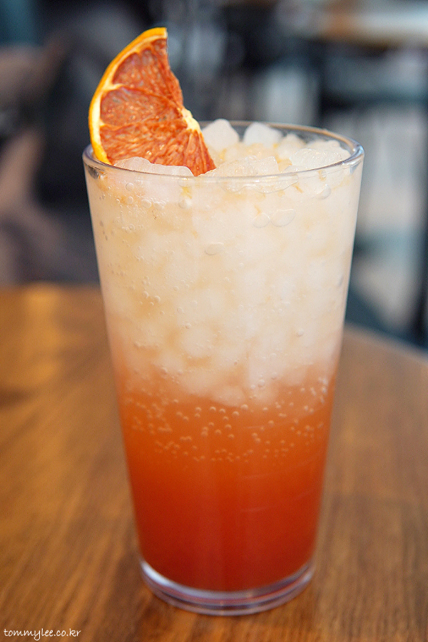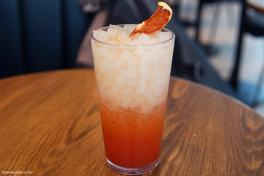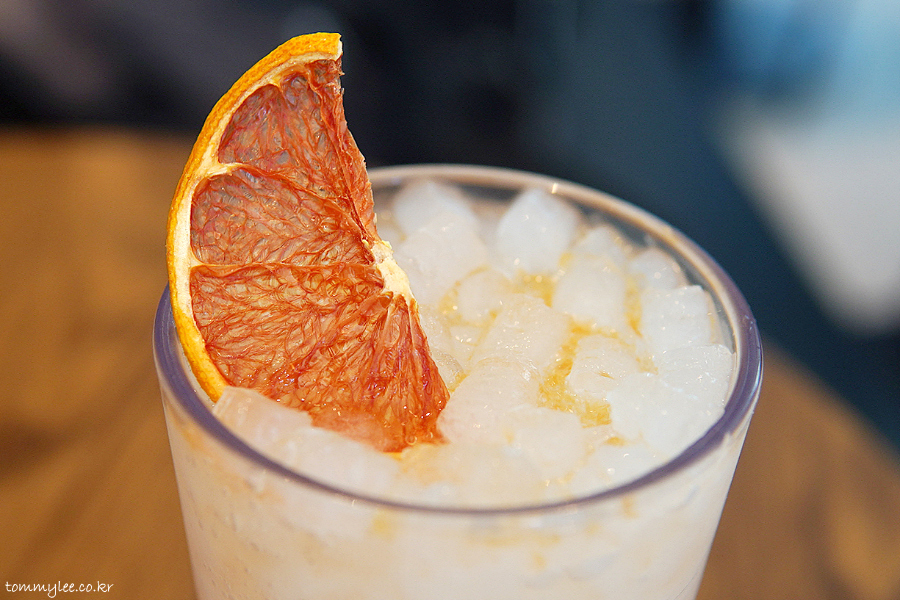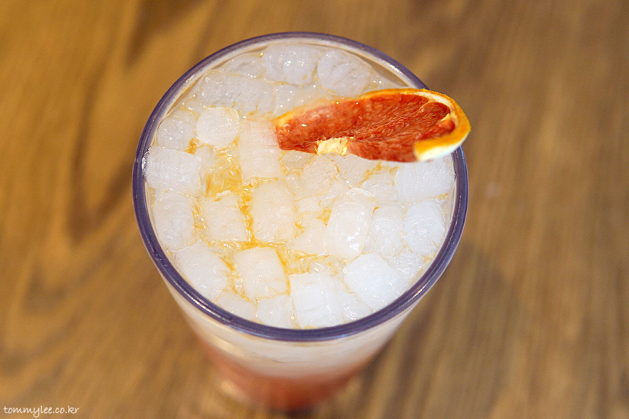 건조 자몽칩으로 장식된 핑크 구아바 리치 블루밍.. 신메뉴이고 핑크 구아바와 리치가 들어간 캐모마일티 베이스의 아이스티입니다..
