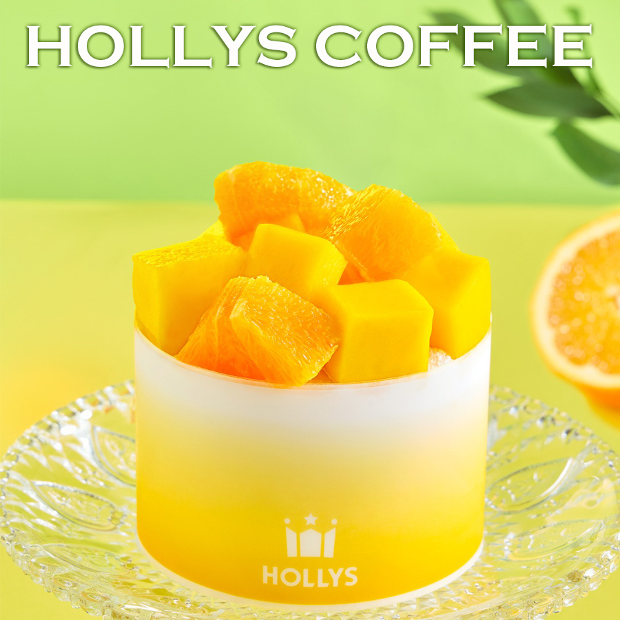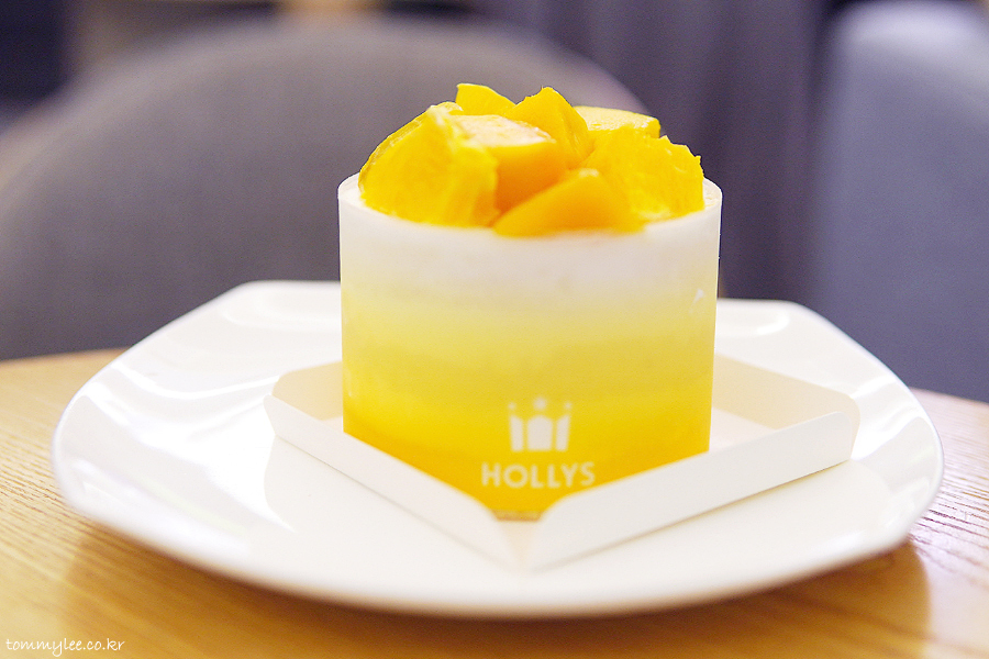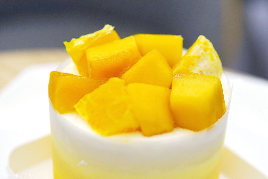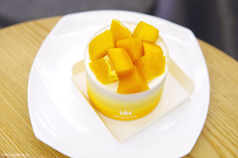 요즘 대유행 중인 망고가 잔뜩 올라간 망고폭탄 케이크 스타일로 나온 디저트 신메뉴입니다.. 다른 곳들은 핑크자몽을 섞던데 할리스는 특이하게 오렌지와 망고를 조합했네요..
