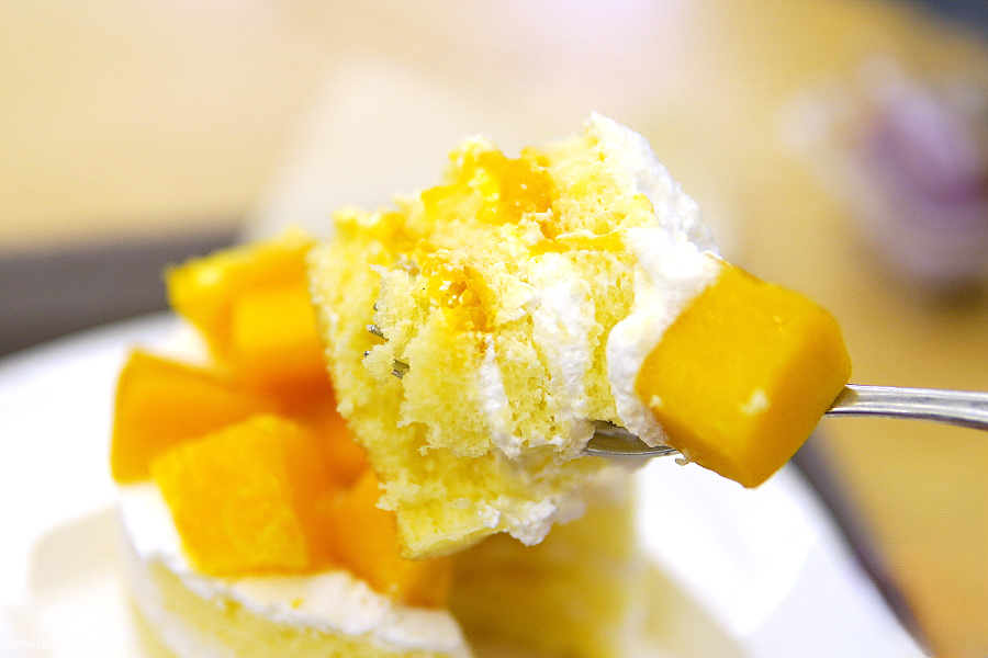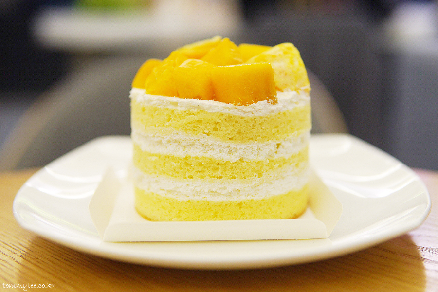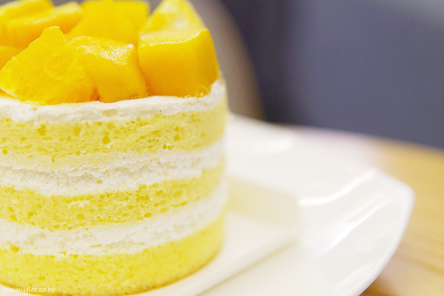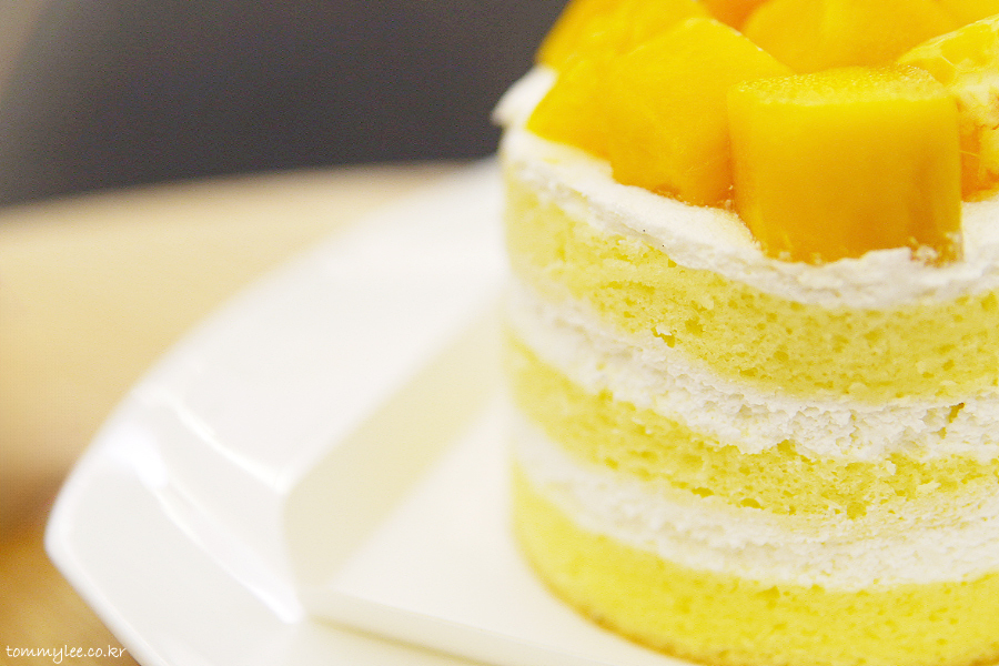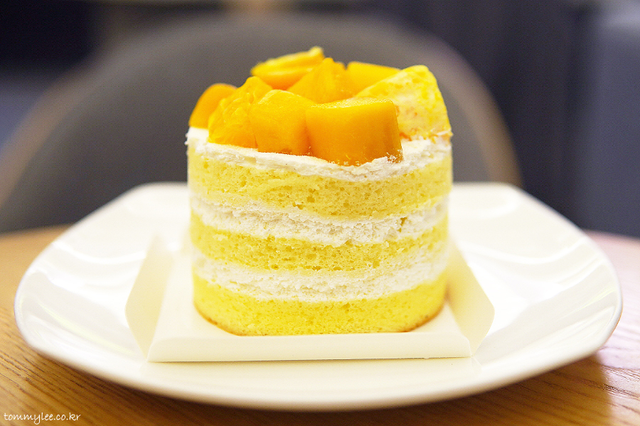 케이크 시트 사이사이에 생크림과 망고퓨레.. 매우 심플한 구성이라 맛이 없진 않아요.. 오렌지랑 애플망고 토핑도 큼직하고..