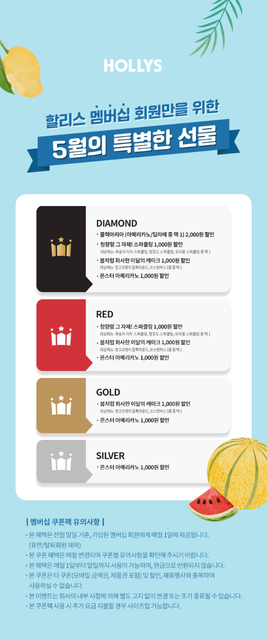 할리스 멤버십 회원만을 위한 5월의 특별한 선물.. 할리스 멤버십 쿠폰 혜택이 전보다 너무 많이 줄어서 최근엔 앱 쿠폰을 잘 안 써요.. 5월만 해도 케이크 천원 할인, 아메리카노 천원 할인으로 제가 보기엔 장난치는 수준이라서.. 그나저나 이번엔 카카오톡 선물하기 모바일상품권 사용으로 쿠폰 적용은 어차피 안되었네요..