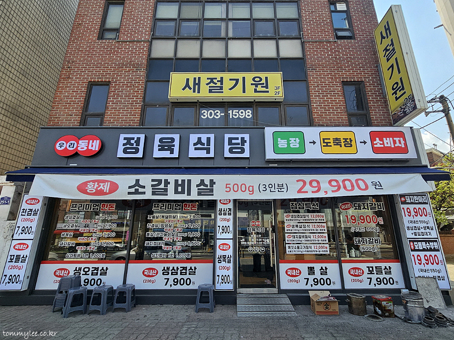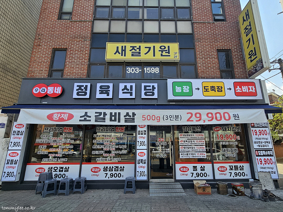 지인분께서 투썸플레이스 새절역점 근처에 매일 줄을 서는 고깃집이 생겼다고 한번 가보고 싶다고 하셔서 우리동네 정육식당이라는 고깃집을 가보게 되었습니다.. 저는 이 근처를 지나다닐 일이 없어서 전혀 몰랐지만, 짧은 영업기간동안 맛집으로 소문이 잘 났는지 밥시간엔 웨이팅이 항상 있다고 합니다.. 바로 근처에 비슷한 컨셉의 축산정육식당고깃집 새절본점이 있고, 응암오거리엔 마장동고기집 응암점이 자리하고 있는데요.. 경쟁력이 나름 있는지 의외로 인기몰이 중이라고 함.. 우리동네정육식당은 직거래로 저가격을 실현한 가성비 고깃집이고 프랜차이즈랍니다.. 본점은 남영역에 있다고 하네요..