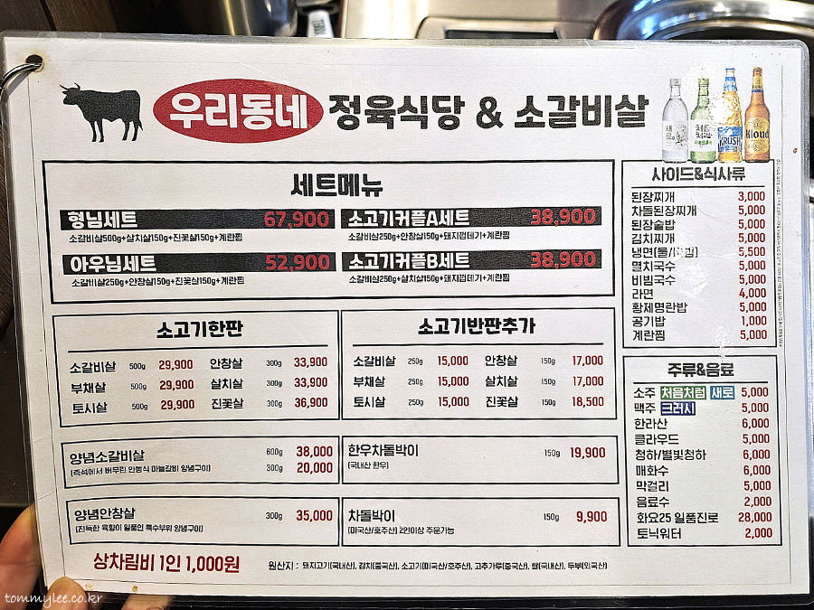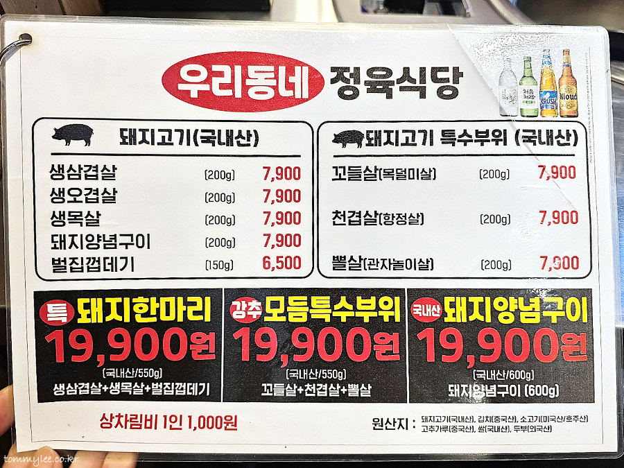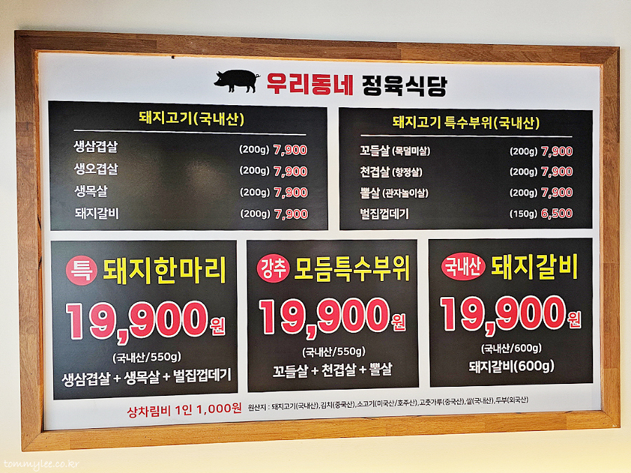 점심시간 방문.. 의외로 손님이 많더라고요.. 그래서 인테리어샷은 없습니다.. 벽에 있던 메뉴 보드 찰칵.. 돼지한마리 19,900원, 모듬특수부위 19,900원, 돼지갈비 19,900원.. 상차림비 1인 1,000원이라고 합니다..