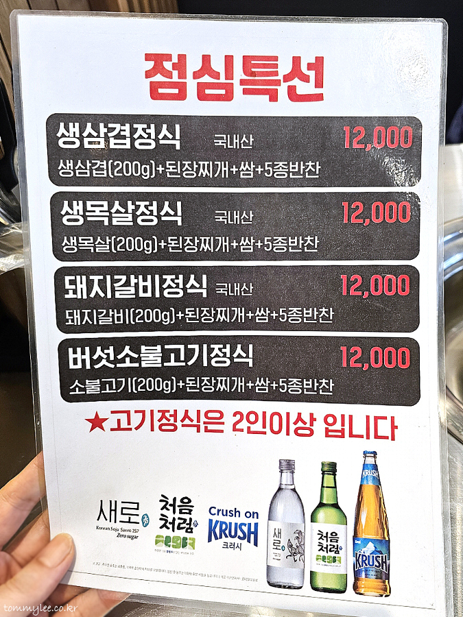 점심특선 : 고기 200g + 된장찌개 + 쌈 + 5종반찬.. 생감겹정식, 생목살정식, 돼지갈비정식, 버섯소불고기정식.. 균일가 12,000원입니다.. 점심특선 돼지갈비정식 3인분 주문했고요..