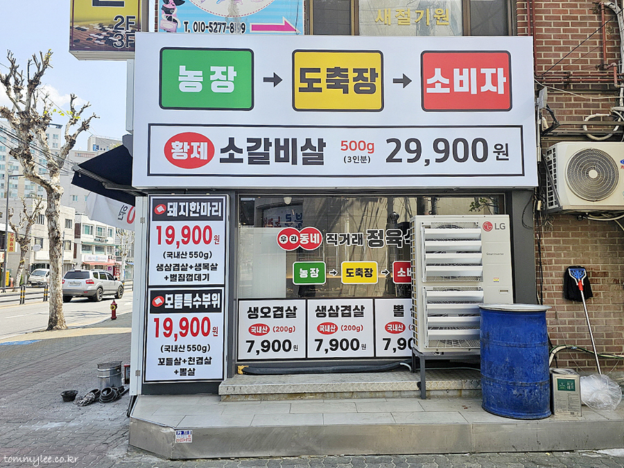 농장→도축장→소비자.. 직거래 정육식당을 컨셉으로 하고 있는 것 같고요.. 황제 소갈비살 500g 29,900원, 생삼겹살 7,900원이란 저렴한 가격을 무기로 하고 있습니다.. 전에 이마트24 편의점이 있던 자리에 오픈했어요.. 위치는 투썸플레이스 새절역점 옆..