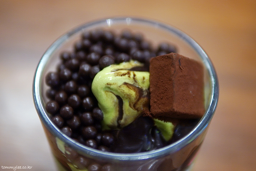 제주 말차 아이스크림에 초코퍼지 소스, 초코볼과 파베초콜릿이 토핑 되어 있답니다.. 홈페이지 메뉴 설명엔 브라우니가 토핑 된다고 잘못 나와있지만 고급진 파베초콜릿이 토핑 됩니다.. 일반적인 생초콜릿으로 보시면 되겠고요..