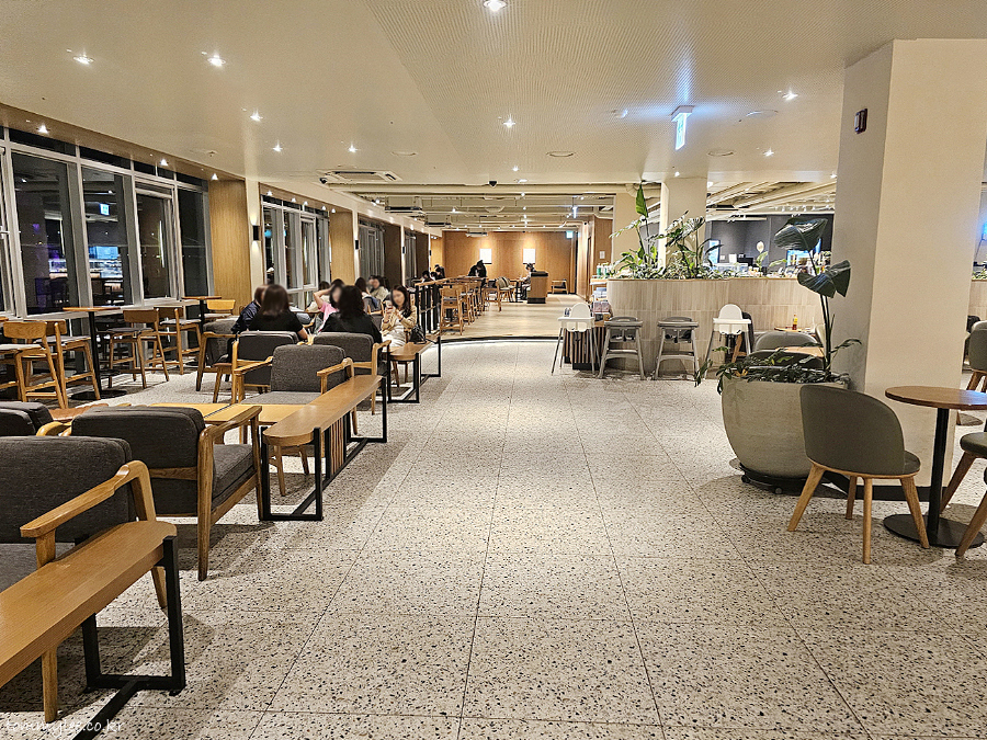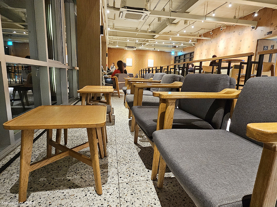 창가쪽은 테이블이 이렇게 생겼어요.. 한강 뷰를 바라보며 커피 마실 수 있는 훈훈한 환경.. 근데 이 시간에 오면 별로 보이는 건 없고 그냥 암흑임.. ㅋㅋㅋ.. 야경은 의외로 처참함.. 강 건너편에 밤에 빛을 내줄만한 게 딱히 없고.. 성산대교 라이트업 없는 게 특히나 타격이 크네요..