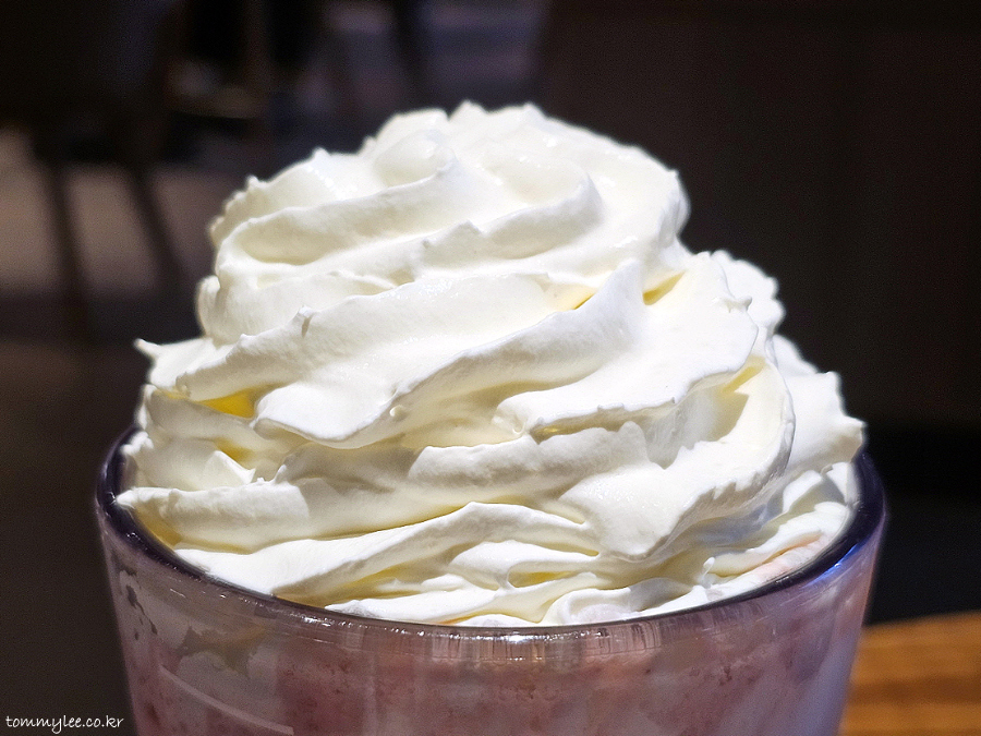 별 12개 무료음료 쿠폰으로 딸기 딜라이트 요거트 블렌디드.. 엑스트라 휘핑크림 커스텀을 붙였더니 이렇게 휘핑크림을 잔뜩 올려 주셨고요..