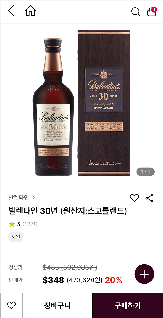 진에어 스카이샵에선 발렌타인 30년을 20%할인된 $348.. 47만원대에 구입할 수 있었는데요..