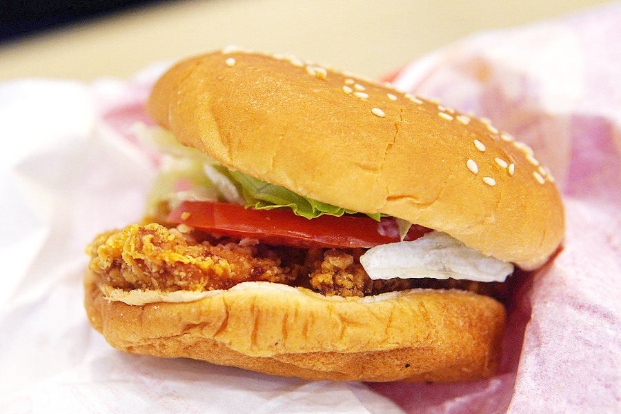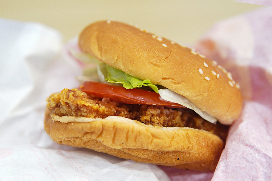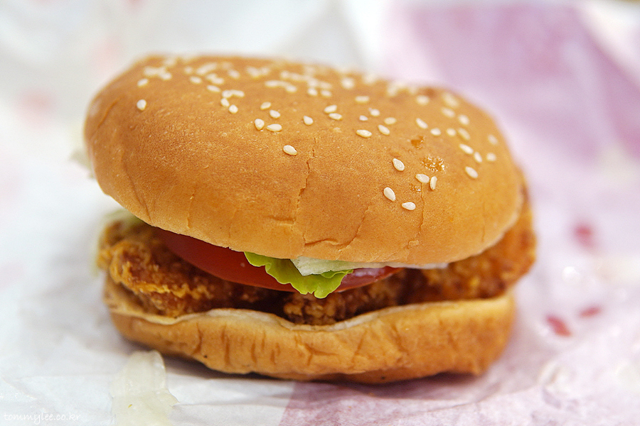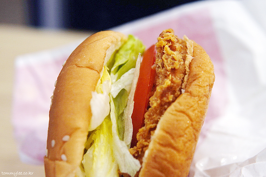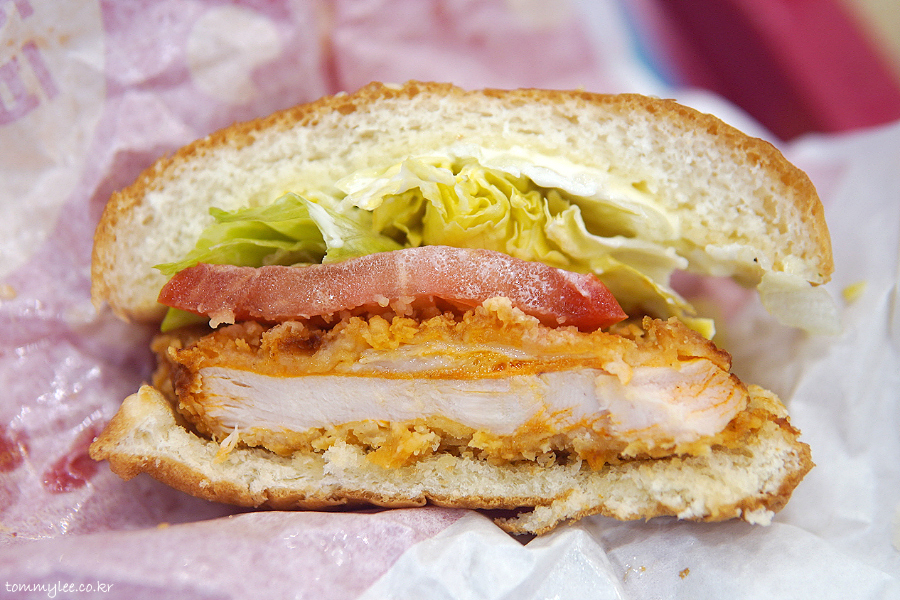 핫크리스피 치킨버거 구성은.. 쎄서미번-마요네즈-양상추-토마토-닭가슴살패티-번의 순서..