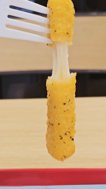 치즈스틱을 이렇게 살살 흔들어주면 모짜렐라 치즈가 쭉쭉 늘어난답니다..