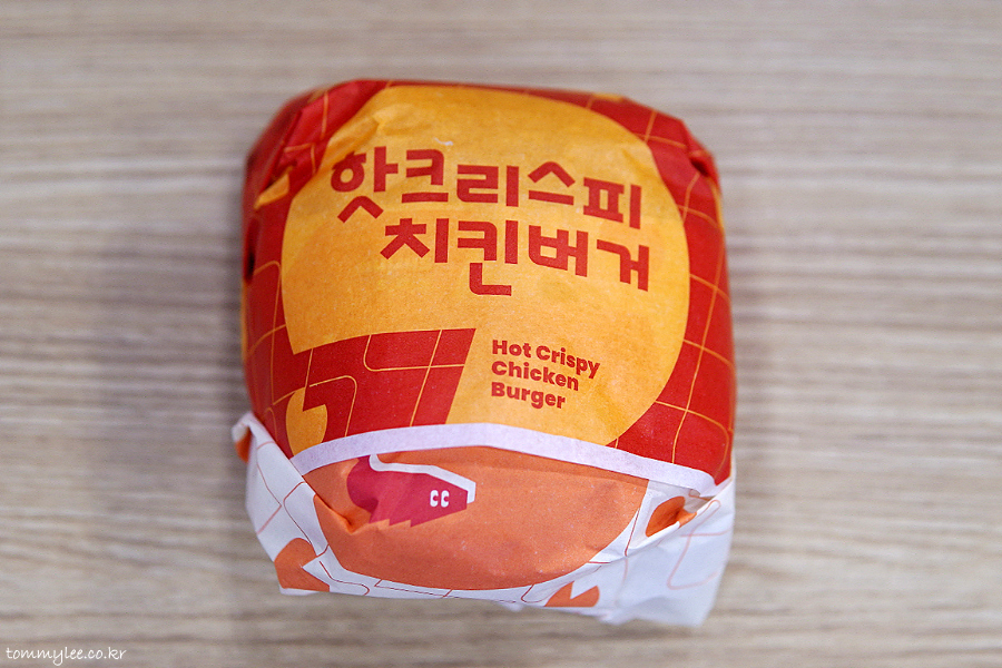 핫 크리스피 치킨 버거 오랜만이네요.. 빨간 랩지를 벗겨 보면 이런 느낌..