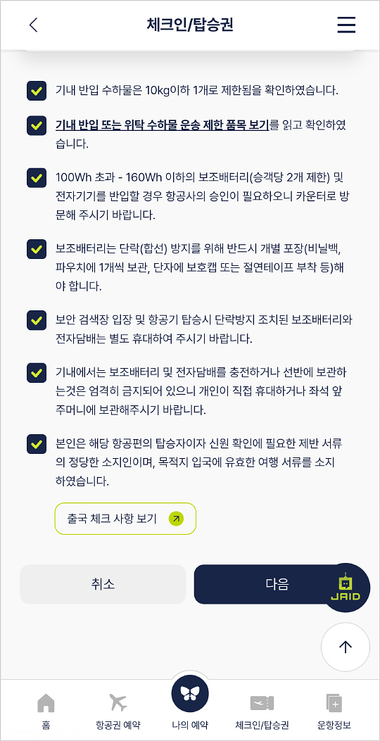 기내 반입 수하물, 위탁수하물, 보조배터리, 전자담배 등 출국 전 체크 사항 확인 후..