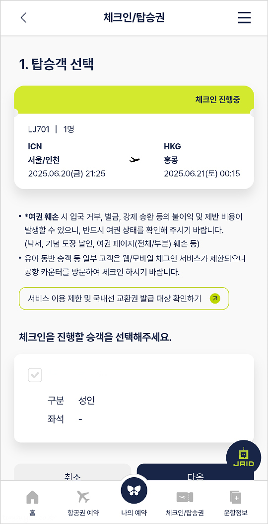 진에어는 탑승 24시간 전부터 모바일 및 웹 체크인을 할 수가 있답니다.. 체크인으로 들어가서 체크인 진행할 승객 선택..