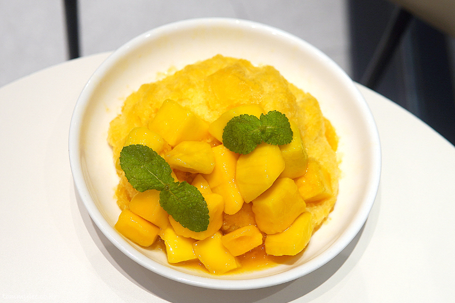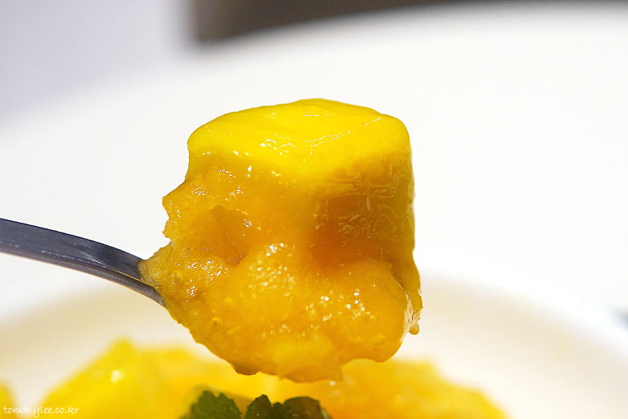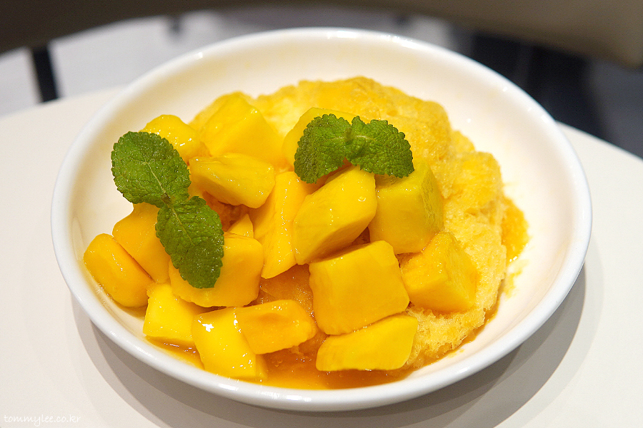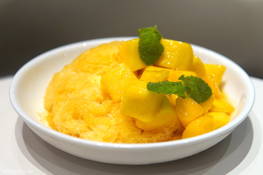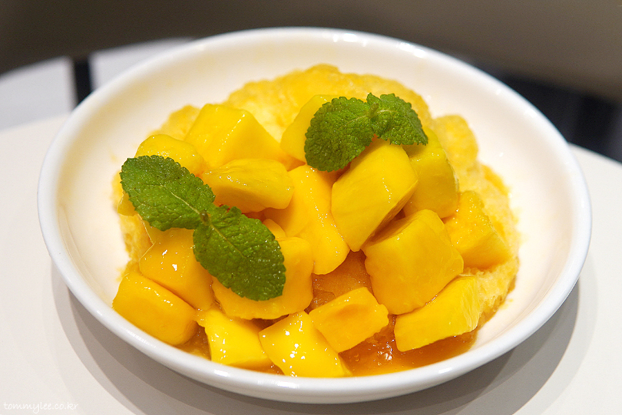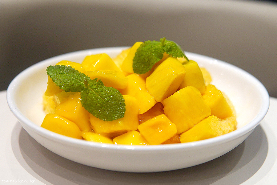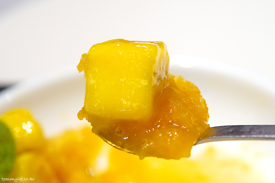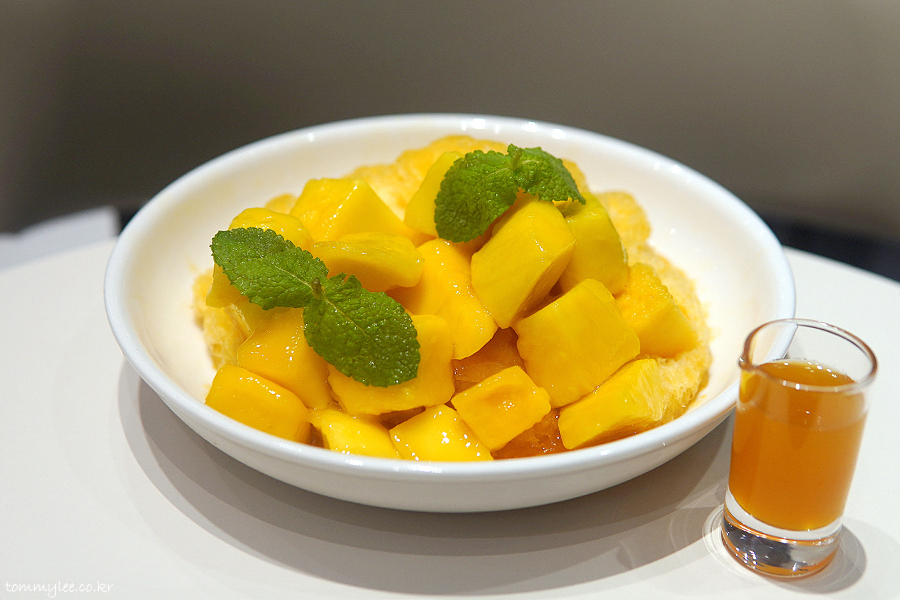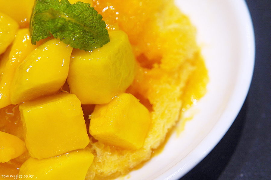 위에서 바라보면 이런 느낌.. 망고를 깍뚝썰기한 애플 망고 다이스가 빙수의 반 정도를 덮고 있고요.. 애플민트잎으로 장식된 모습..