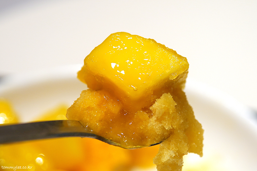 애플망고빙수의 뒷쪽은 이렇게 망고 얼음이 자리하고 있습니다.. 망고 얼음은 망고 샤베트 느낌이라고 보시면 되는..