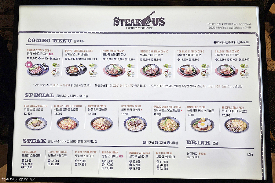 스테이크어스에서 가장 비싼 스테이크랍니다.. 콤보 메뉴는 샐러드콤보와 통감자콤보 2가지가 있고 +3,000원에 스프&샐러드 또는 스프&통감자가 제공.. 여기 스프 전 필요 없어서 거의 단품으로만 먹어요..