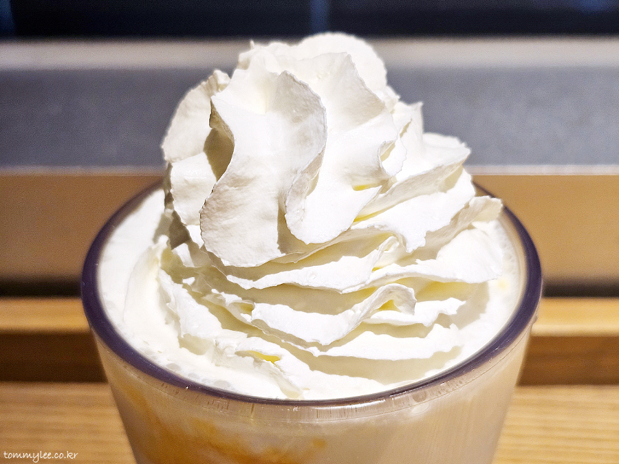 자몽 토핑이 오늘은 휘핑크림 아래에.. 휘핑크림 위에 올려 주는 센스있는 분은 극소수.. ㅠ.ㅠ.. 코코넛밀크 베이스에 자몽망고 소스와 자몽과육 토핑이 조화롭게 들어간 과일계 블렌디드..