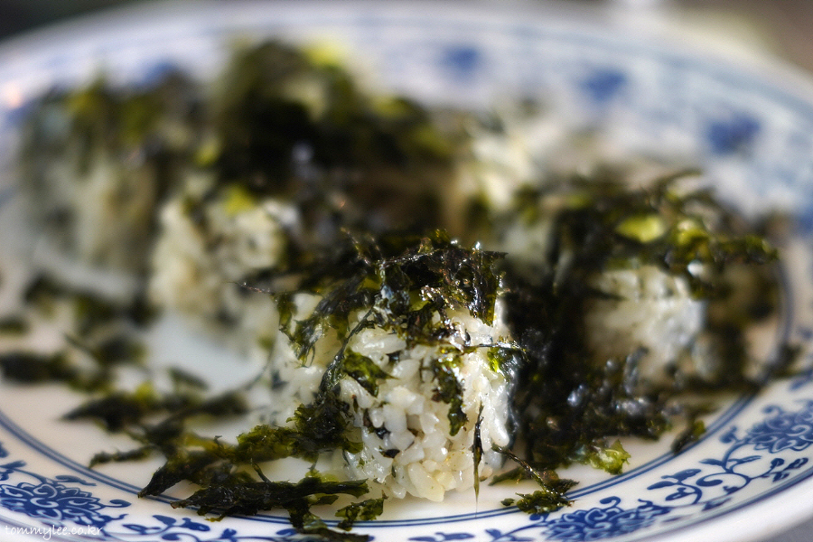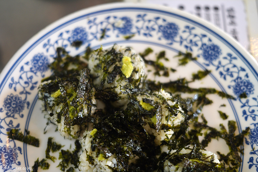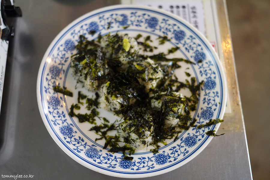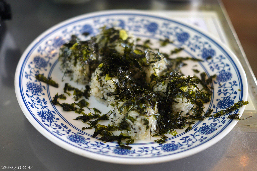 김가루가 뿌려진 초밥의 샤리 느낌으로 보셔야 할 것 같아요.. 그래서 와사비도 올려져 있는 것이겠고요.. 초밥 네타처럼 고기 토핑을 올려 대창 주먹밥이나 우삼겹 주먹밥으로 해서 먹거나 떡볶이를 다 먹은 후 비벼 먹어도 OK.. 저흰 반반하기로.. ㅡㅡ;;..