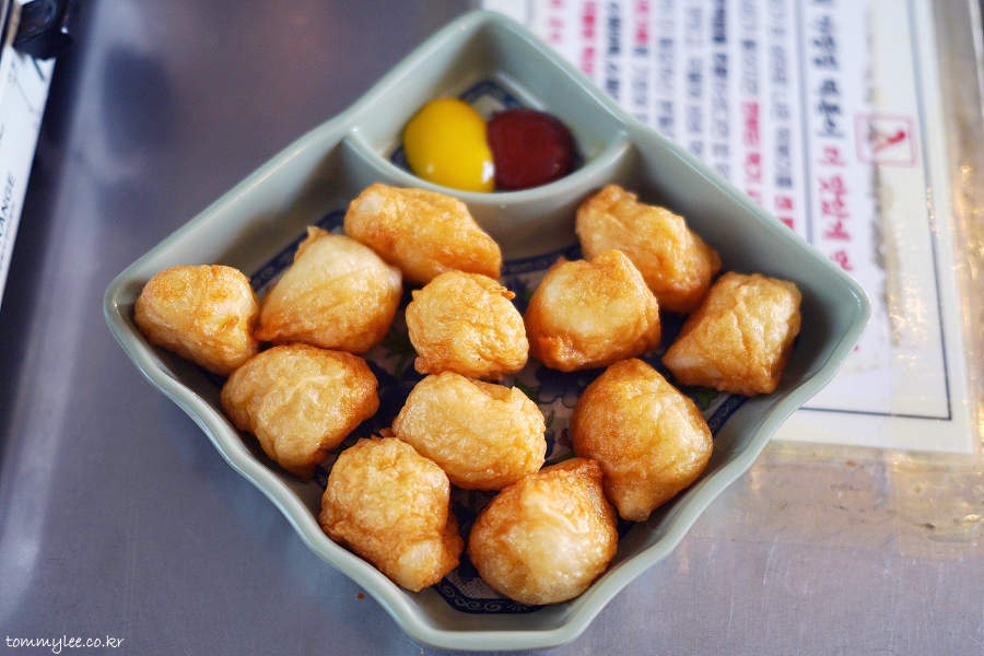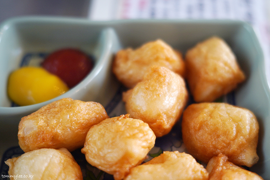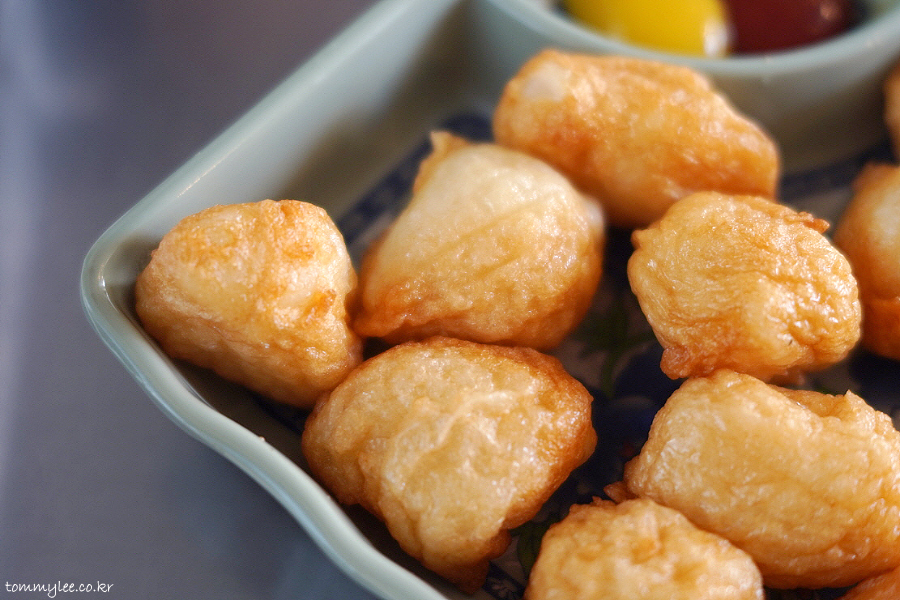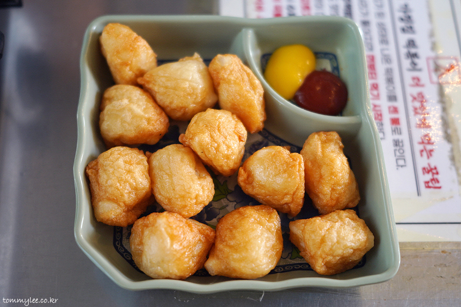떡을 어묵 반죽으로 감싸 튀겨낸 느낌으로 보셔야 할 것 같아요.. 같이 나온 케찹, 머스터드와 함께 사이드 메뉴로 먹어도 되고, 떡볶이에 사리로 넣어 먹어도 된다고 함..