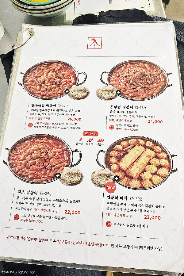 입분식 가정집 메뉴판.. 한우대창 떡볶이 26,000원, 우삼겹 떡볶이 24,000원, 치즈 닭볶이 22,000원, 입분식 어떡 22,000원.. 일반 즉석떡볶이도 있는데 가격이 14,000원인 걸 보면 비싼 집은 아닌 듯..