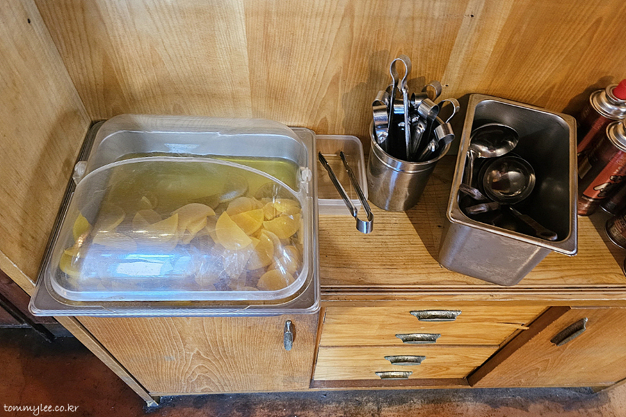 넘나 레트로했던 셀프바.. 단무지와 국자, 집게, 앞접시를 미리 준비합니다..