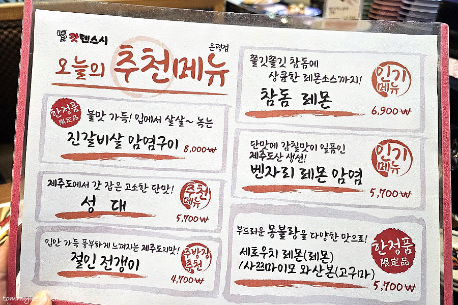 갓덴스시 롯데몰은평점 오늘의 추천 메뉴.. 참돔레몬 6,900원, 진갈비살암염구이 8,000원, 벤자리레몬암염 5,600원, 성대 5,700원, 절인전갱이 4,700원, 체토우치레몬/사쯔마이모와산본 5,700원.. 추천메뉴 비싸~..