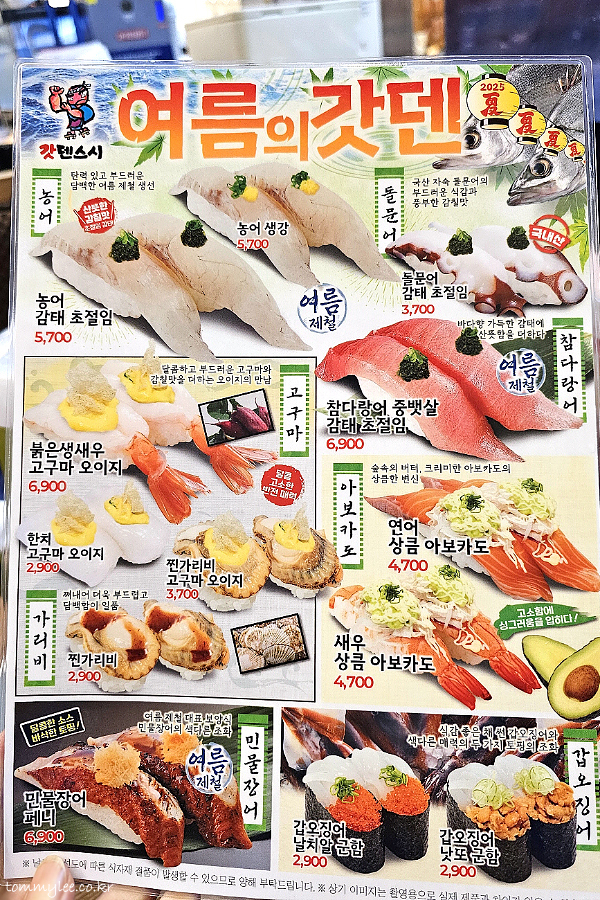 여름의 갓덴.. 계절한정 메뉴들입니다.. 2025 여름 시즌엔 농어, 돌문어를 추천하고 있는 갓덴스시..