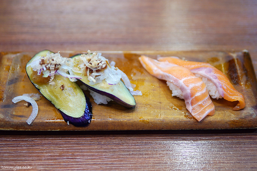 만복의 감정이 엄습해 슬슬 정리하기로.. 튀김을 많이 먹었더니 엄청 배불러와서.. ㅡㅡㅋ.. 오늘도 비주얼 좋게 제공된 튀긴가지초밥.. 가지를 도톰하게 슬라이스해 살짝 튀겨 내고 양파와 소스를 곁들여 내주는데.. 오늘 주문한 초밥 중에 의외로 젤 맛났던..