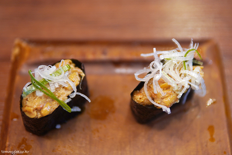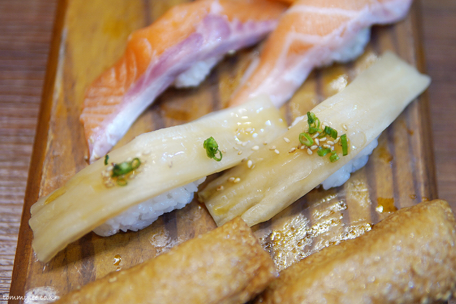 참기름을 발라낸 씻은지 초밥인데.. 네타가 샤리 사이즈 4배 정도는 되는 듯.. 퀄리티 좋고요..