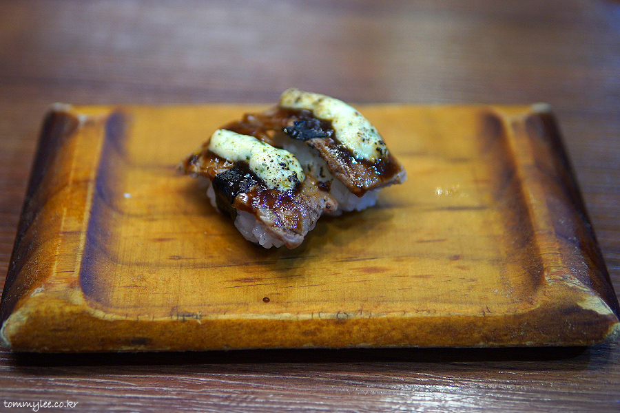 아부리 해야 해서 그런지 다른 초밥보다 살짝 늦게 나온 갈릭치즈 스테이크 초밥.. 소스를 충분히 발라내고 갈릭치즈를 올려 아부리해 냈습니다.. 가성비가 엄청 좋아요.. 1,500원짜리 초밥 맞나 싶을 정도..