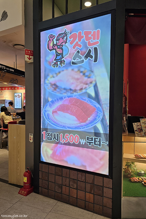 갓덴스시는 롯데몰은평점 4층 팸레존에 자리하고 있답니다.. 위치는 리미니 앞이에요.. 1접시 1,500원부터~를 강조하고 있는 모습.. 일본 회전초밥체인 3대장은 スシロー(스시로), くら寿司(쿠라즈시), はま寿司(하마즈시)고 がってん寿司(갓텐즈시)는 10위 정도인데요.. 우리나라에선 갓덴이 그냥 원탑입니다.. 일본 초밥체인들이 한국시장 문을 꾸준히 두드려왔으나 큰 성과는 거두지 못했는데.. 이유는 모르겠지만 갓덴스시는 인기가 엄청 많더라고요.. 아무래도 퀄리티 우선주의가 한국고객에게 크게 어필하지 않았나 싶음..