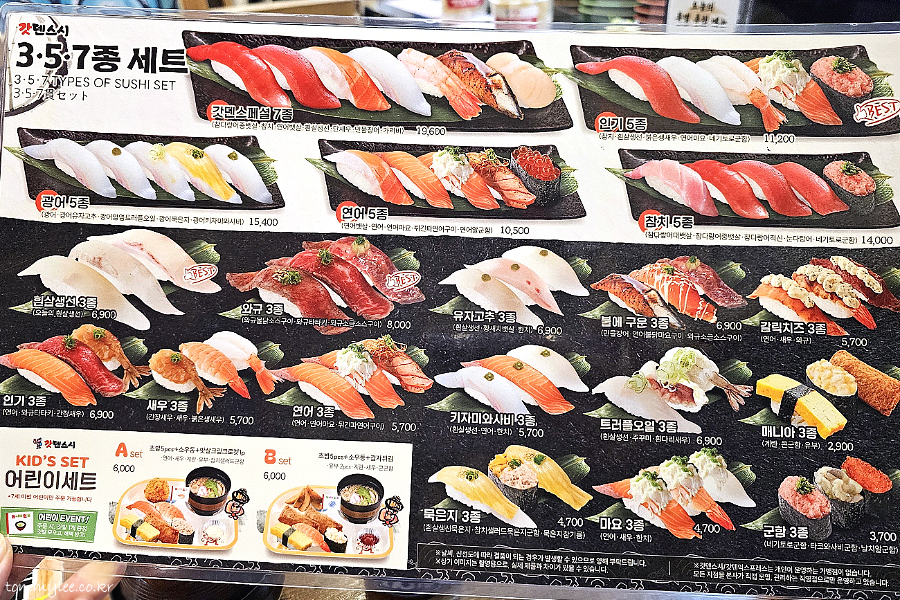 보통은 초밥 단품 메뉴를 많이 드시는데.. 보시다시피 다양한 구성의 세트 메뉴를 갖추고 있고요.. 팸레답게 키즈메뉴까지 완비되어 있답니다.. 어린이세트 도전하고 싶다.. ㅡㅡ;;..