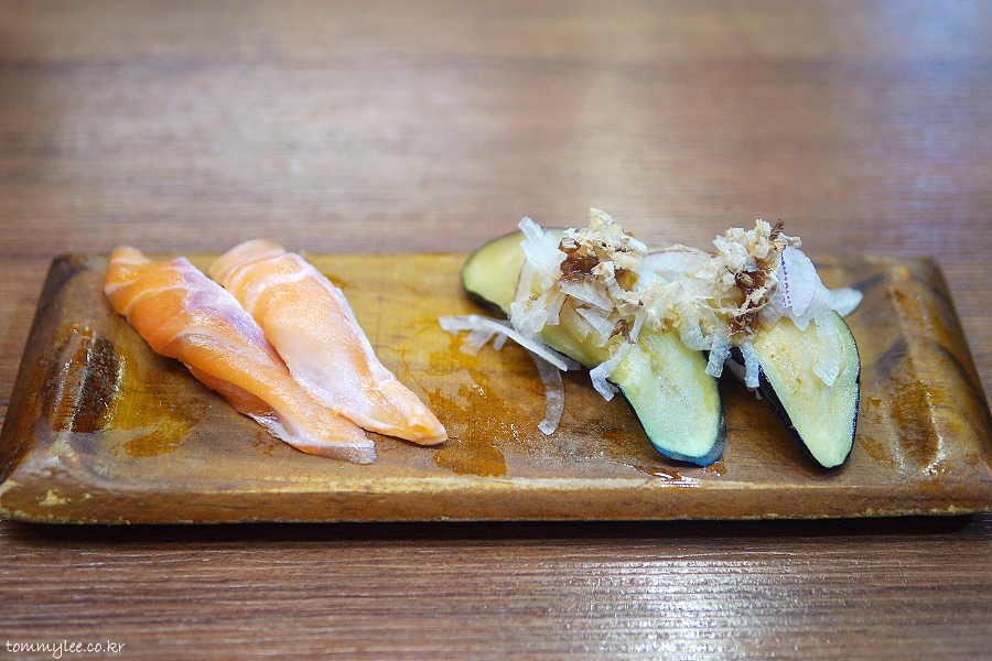 SALMON.. 연어.. 2,900원.. FRIED EGGPLANT.. 튀긴 가지.. 1,500원..