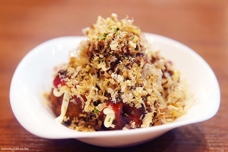 바로 만들어 속안이 레어 상태인 타코야끼에 소스 듬뿍, 마요네즈 드리즐에 카츠오부시 토핑까지 충실하게 올려져 있음.. 단짠단짠 하고 오늘도 퀄리티 좋네요..