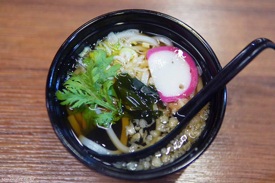 냉우동은 아쉽게도 없었네요.. 뜨거운 카케우동인데요.. 텐가스와 미역, 쑥갓, 카마보코가 올라가 있답니다.. 새우튀김 따로 주문 후 토핑해서 새우튀김우동으로 먹으면 훨씬 맛나다는 거..