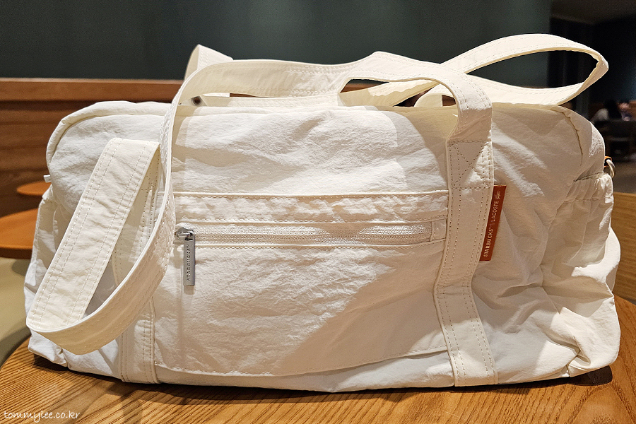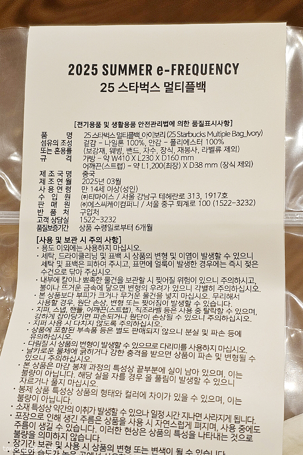 품명 : 25 스타벅스 멀티플백 아이보리.. 소재 : 겉감-나일론100%, 안감-폴리에스터100%.. 규격 : W410*L230*D160mm, 스트랩 L1200*D38mm.. MADE IN CHINA..