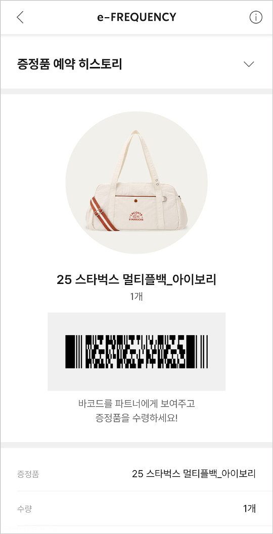 스타벅스 멀티플백 아이보리 교환권의 모습.. 이거 받는 게 어찌나 어렵던지.. 그래도 예전에 레디백 받는다고 새벽에 매장 앞에서 줄 서야 했던 그 암울했던 시절보단 엄청나게 편해진 거랍니다.. 이 더운 여름 날씨에 매장 앞에서 몇 시간 줄을 선다고 생각해보시면 온라인 예약이 얼마나 편한지 답이 나오죠..