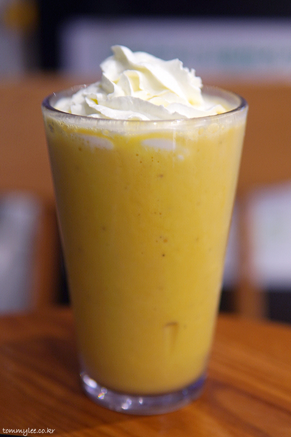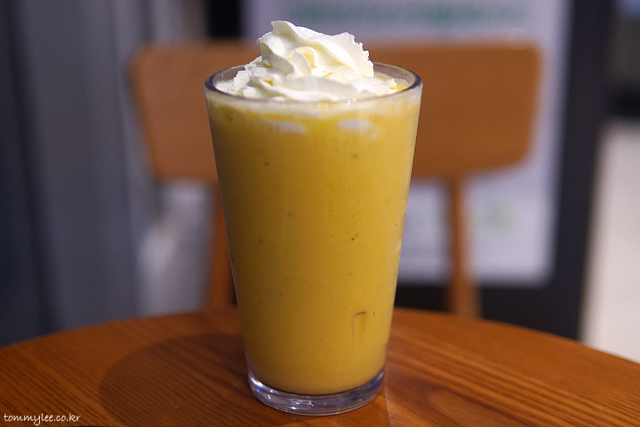 프레시 바나나, 망고 주스, 우유와 얼음의 조합.. 망고와 바나나 두 가지 맛에 집중한 블렌디드로 맛이나 가성비 모두를 잡은 메뉴가 아닐까 싶습니다.. 다른 블렌디드 가격이 죄다 올라서 망고 바나나 블렌디드가 상대적으로 저렴해졌다는 사실..