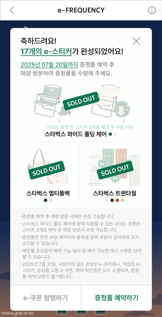 내 쿠폰함에 2025 서머 E-프리퀀시 무료 음료 대체 E-쿠폰 3장이 들어옴으로 올해 프리퀀시 대전쟁은 마무리되었답니다.. 유효기간은 9월17일까지로 길지 않으니 주의를.. 90일은 줘야 하는 거 아닌가.. ㅡㅡa..
